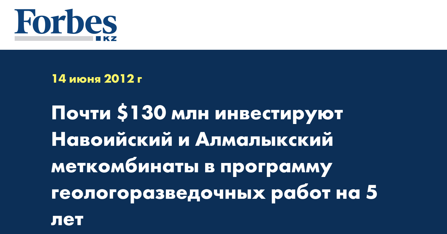 Узбекские ГП «Навоийский горно-металлургический комбинат» (НГМК) и ОАО «Алмалыкский горно-металлургический комбинат» (АГМК, Алмалык, Ташкентская область) в 2012-2017 гг инвестируют в программу геологоразведочных работ в республике около $130 млн, сообщили в департаменте ТЭК кабинета министров республики, передает КазТАГ.