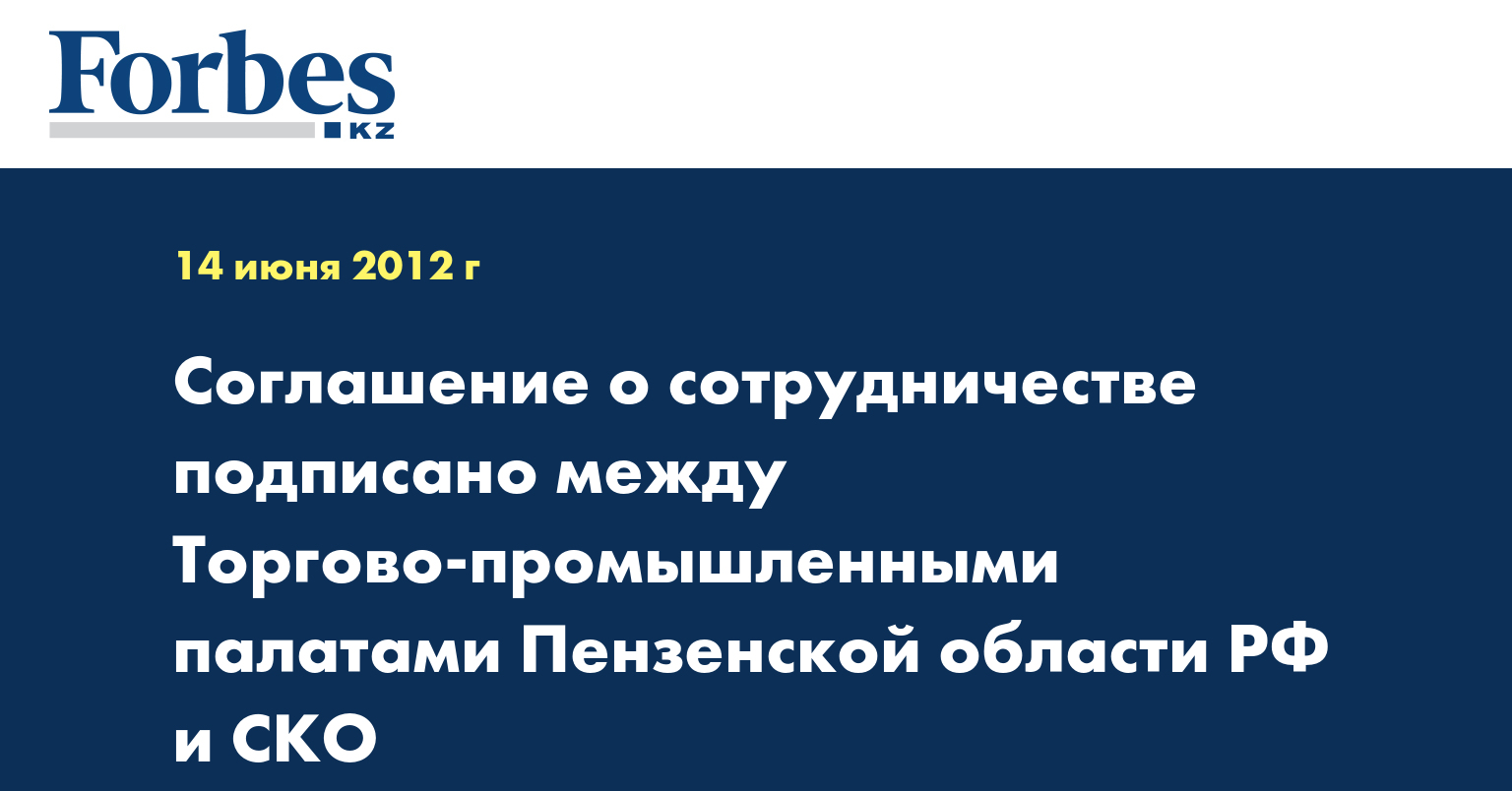 Соглашение о сотрудничестве подписано в четверг между Торгово-промышленными палатами Пензенской области РФ и Северо-Казахстанской области (СКО).