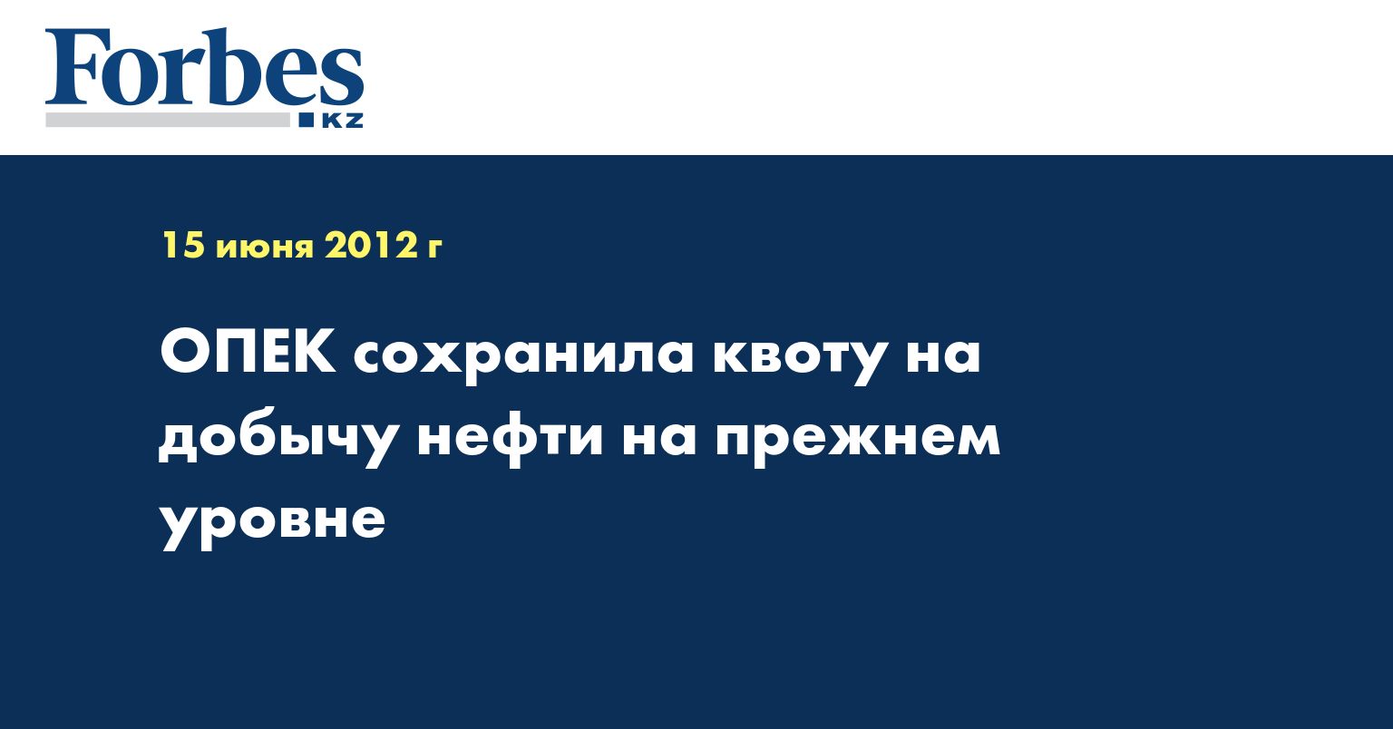 Организация стран - экспортеров нефти (ОПЕК) в четверг, 14 июня, приняла решение сохранить на прежнем уровне квоту на добычу нефти, чтобы не допустить дальнейшего падения цен на нефть. Об этом сообщает Reuters. В настоящее время квота составляет 30 миллионов баррелей в сутки, передает Lenta.ru.