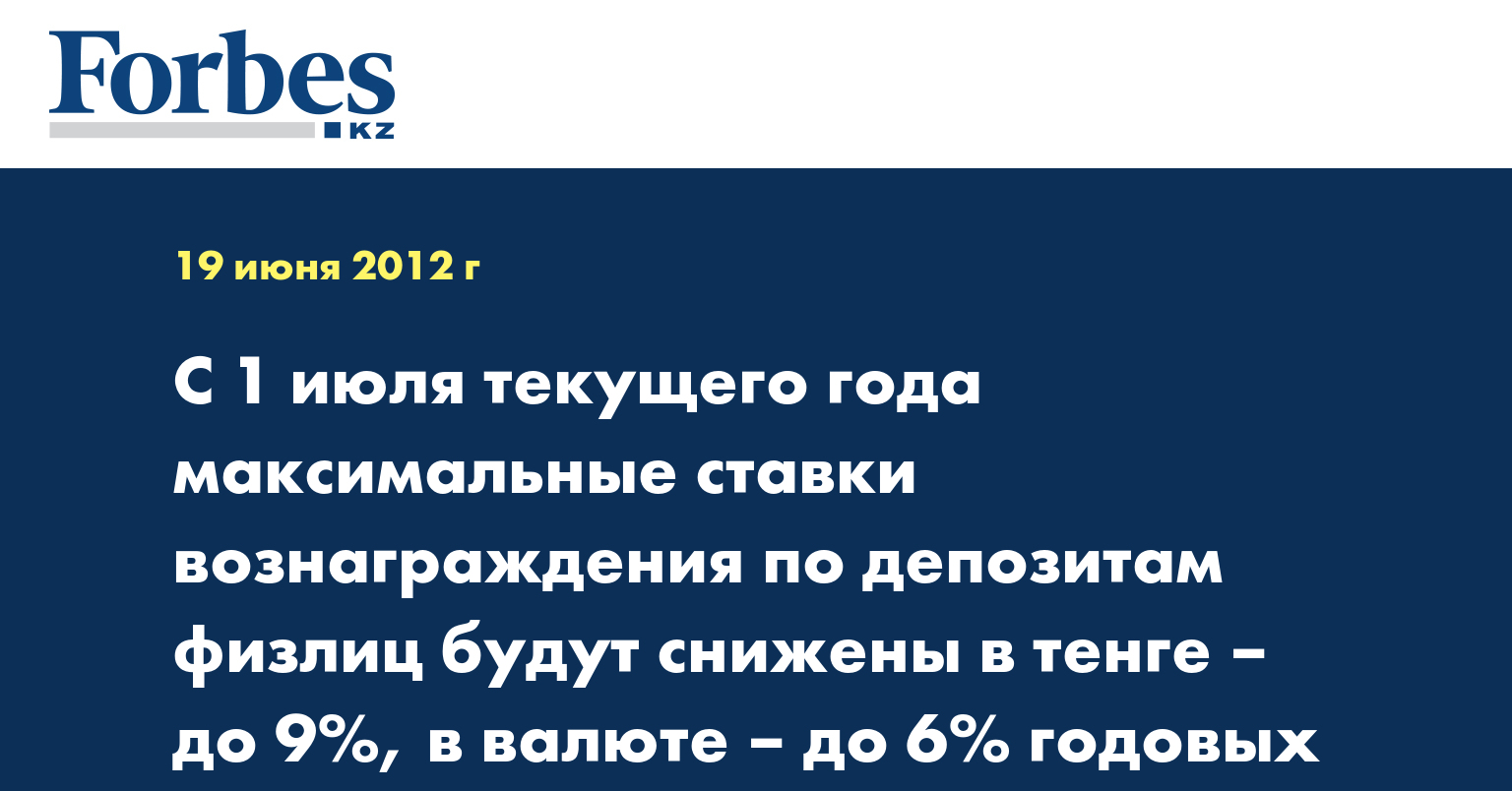 Напомним, что действующие до настоящего момента ставки вознаграждения депозитов физических лиц были установлены «Казахстанским фондом гарантирования депозитов» 1 апреля 2010 года на уровне: в тенге – 10% годовых, в иностранной валюте – 7% годовых.