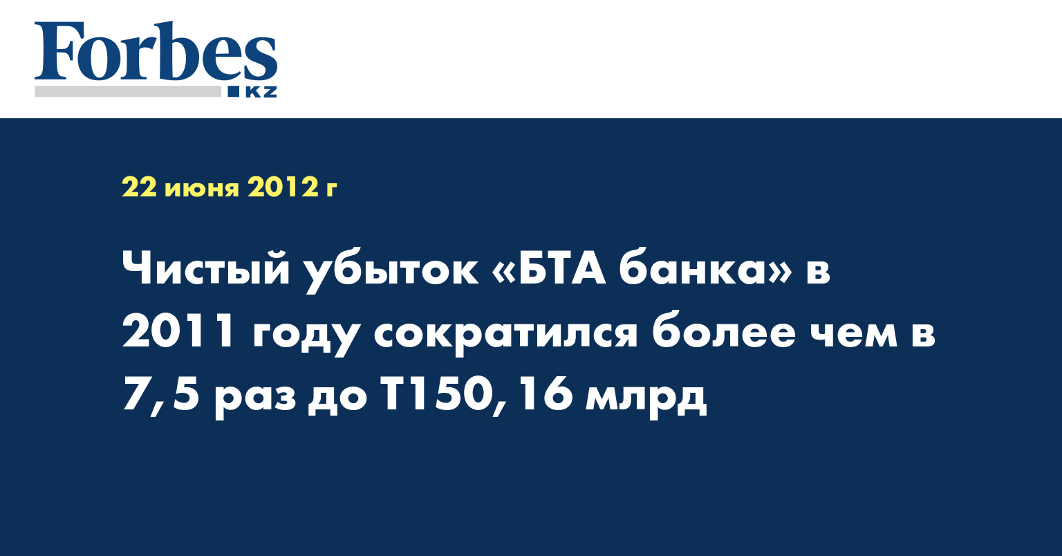 Чистый убыток АО «БТА банк», согласно неконсолидированной финансовой отчетности, в 2011 году сократился в 7,66 раза, составив Т150,16 млрд против чистого убытка в Т1,15 млрд в 2010 году, указывается в информации, размещенной на сайте банка, передает КазТАГ.