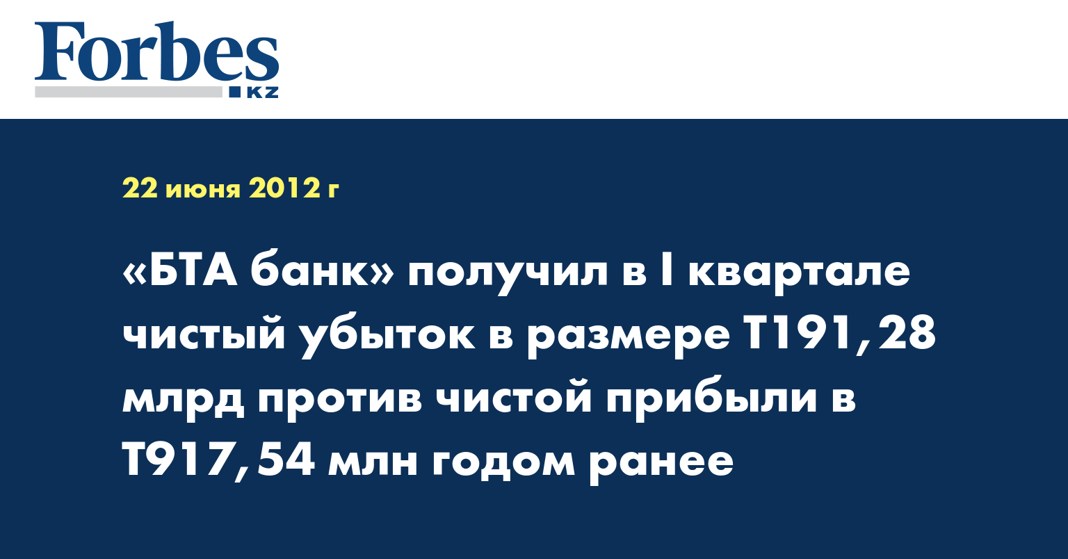 Чистый убыток АО «БТА банк», согласно неконсолидированной неаудированной финансовой отчетности, в I квартале 2012 года составил Т191,28 млрд против чистой прибыли в Т917,54 млн за аналогичный период 2011 года, указывается в информации, размещенной на сайте банка, передает КазТАГ.