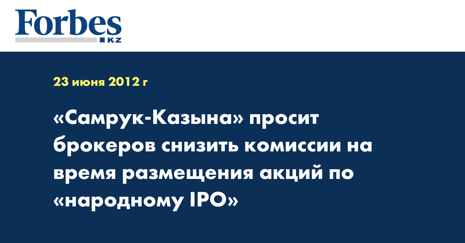 АО «Фонд национального благосостояния «Самрук-Казына» обратилось с просьбой к брокерам снизить комиссии за обслуживание на время размещения акций в рамках реализации программы «народного IPO», говорится в сообщении, опубликованном на официальном веб-сайте программы «народного IPO», передает КазТАГ.
