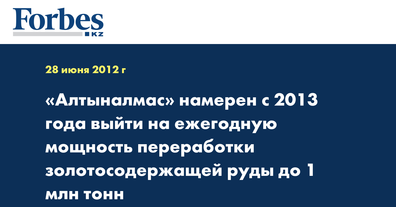 АО «АК «Алтыналмас» намерено с 2013 года выйти на ежегодную мощность переработки золотосодержащей руды до 1 млн тонн, сообщил директор Акбакайской золотоизвлекательной фабрики Михаил Шубин, передает КазТАГ.