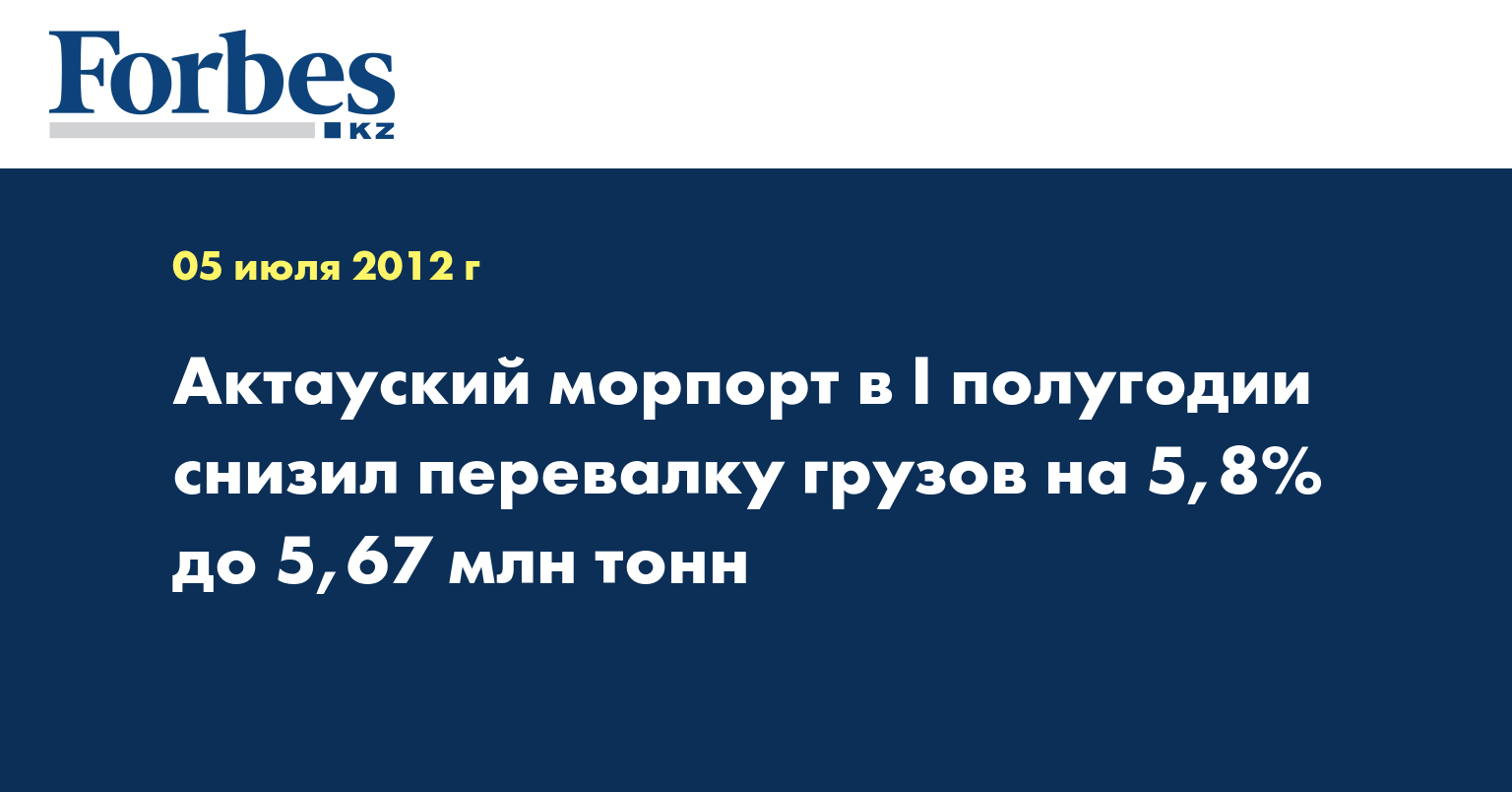 Республиканское государственное предприятие «Актауский международный морской торговый порт» (АММТП) в январе-июне обработал 5,67 млн тонн сухих и нефтеналивных грузов, что на 5,83% меньше, чем в аналогичном периоде 2011 года, указывается в сообщении компании, передает КазТАГ.