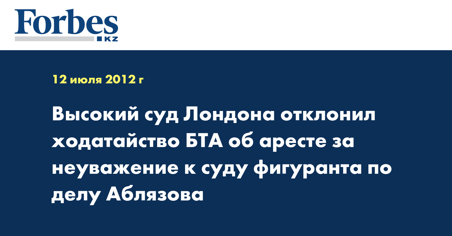В феврале 2012 года Высокий суд Лондона по иску БТА приговорил М. Аблязова к 22 мес. заключения, признав его виновным в неуважении к суду, выразившемся в даче ложных показаний. При этом привести приговор в исполнение до сих пор не удалось, поскольку местонахождение бизнесмена остается неизвестным. По некоторым данным, заочно осужденный мог тайно перебраться во Францию, используя документы, которые ранее сокрыл от предъявления по требованию суда.