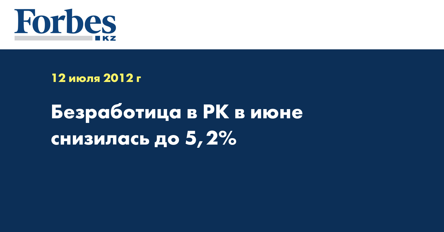 Численность безработных в июне 2012 года составила 470,6 тыс. человек, уровень безработицы – 5,2% (в мае – 5,3%), указывается в сообщении агентства РК по статистике.