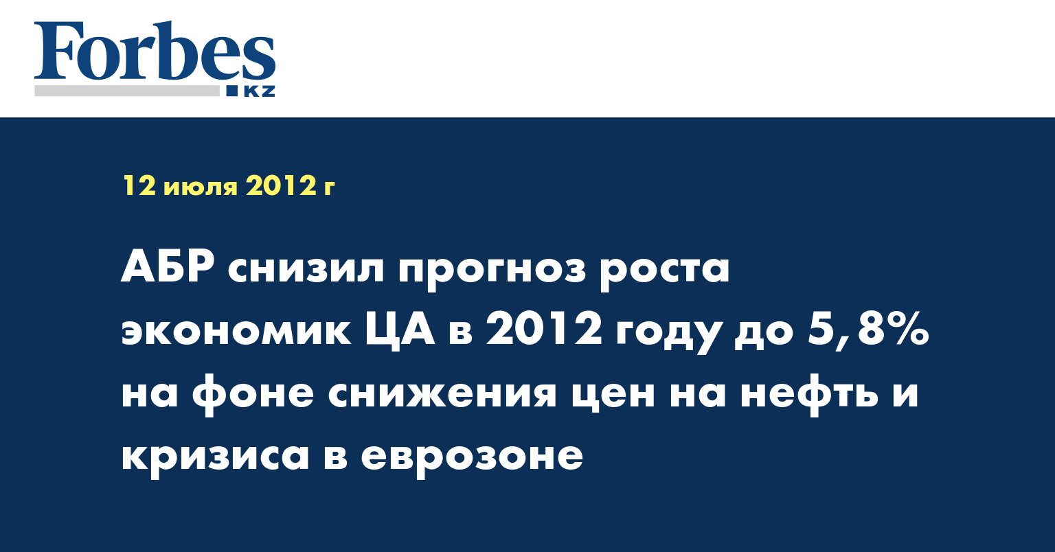 «В «Дополнении к обзору развития Азии» говорится, что снижение цен на нефть и связь с кризисной еврозоной, вероятно, повлияют на рост в Центральной Азии, где экономический рост начал замедление в первой половине 2012 году. Ожидается, что в 2012 году рост Центральной Азии составит 5,8%, что ниже предыдущих прогнозов в 6,1%», - говорится в отчете АБР, распространенном в четверг, передает КазТАГ.