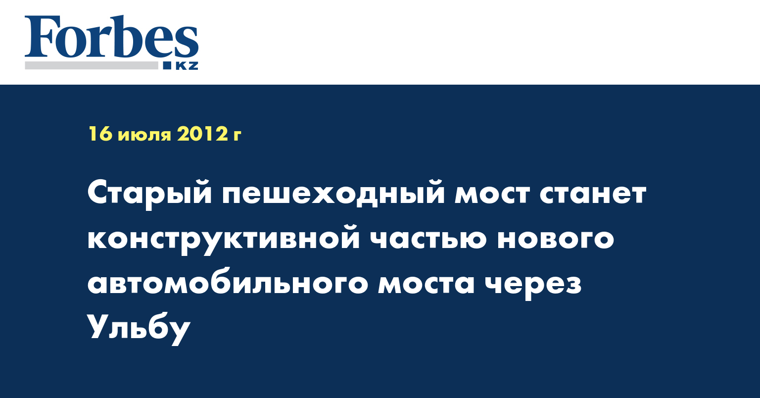 Проектом строительства нового автомобильного моста через реку Ульбу в Усть-Каменогорске предусмотрено использование конструкции старого пешеходного моста, сообщили в пресс-службе акима города, передает КазТАГ.