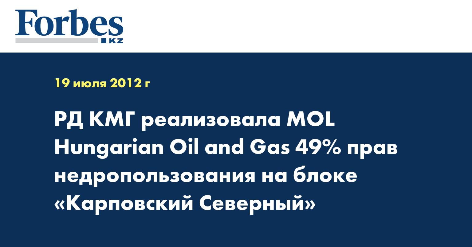 «РД КМГ объявляет о заключении договора купли-продажи с MOL Hungarian Oil and Gas Plc. по реализации 49% пакета акций в АО «Карповский Северный», - отмечается в пресс-релизе, распространенном в среду, передает КазТАГ.