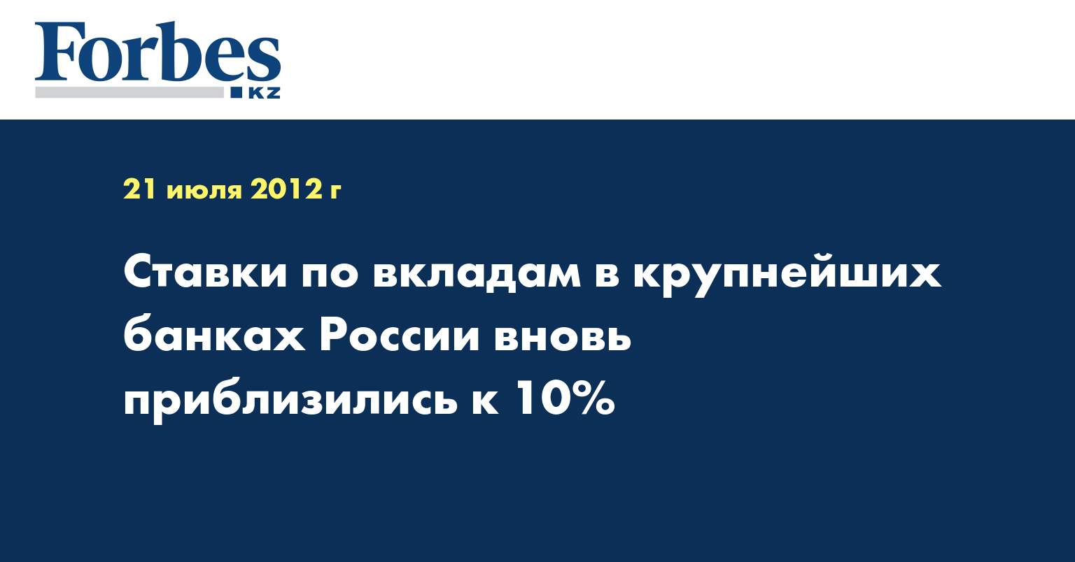 Максимальная ставка по вкладам десяти крупнейших банков России во второй декаде июля составила 9,97 процента, увеличившись на 0,03 процентного пункта по сравнению с предыдущим временным отрезком. Об этом сообщается в пресс-релизе Банка России. Этот показатель является вторым по величине за последние два года - выше ставки были только в начале июня, сообщает Lenta.ru.