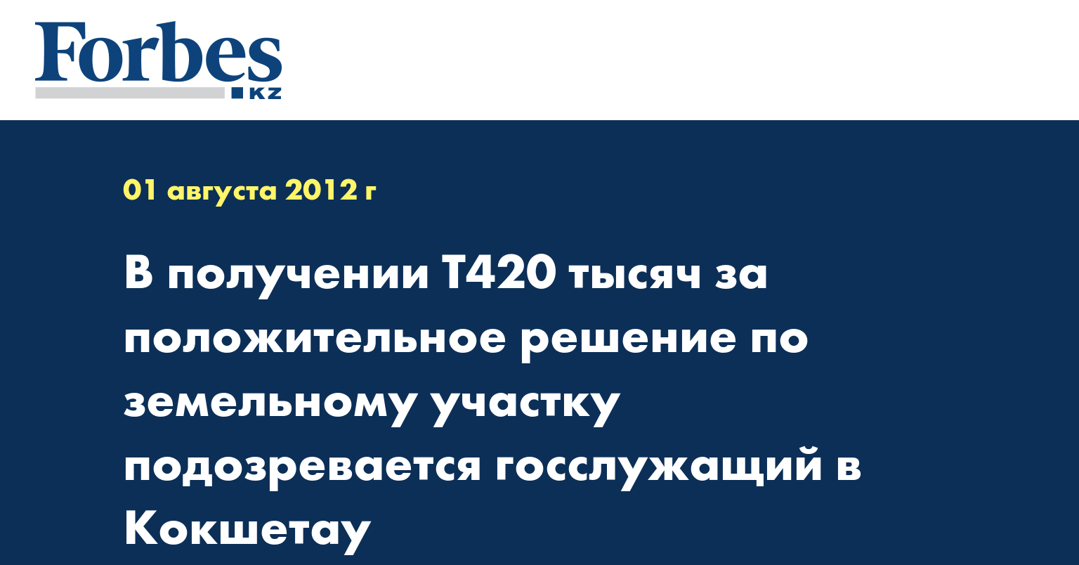 «Также в Акмолинской области 30 июля сотрудниками финансовой полиции по подозрению в получении взятки 30 тыс. тенге от гр. С. за непринятие каких-либо мер по исполнению акта-предписания об освобождении самовольно занятого его супругой земельного участка задержан государственный инспектор по использованию и охране земель Акмолинской областной территориальной земельной инспекции А. Аманбаев», - указывается в сообщении.