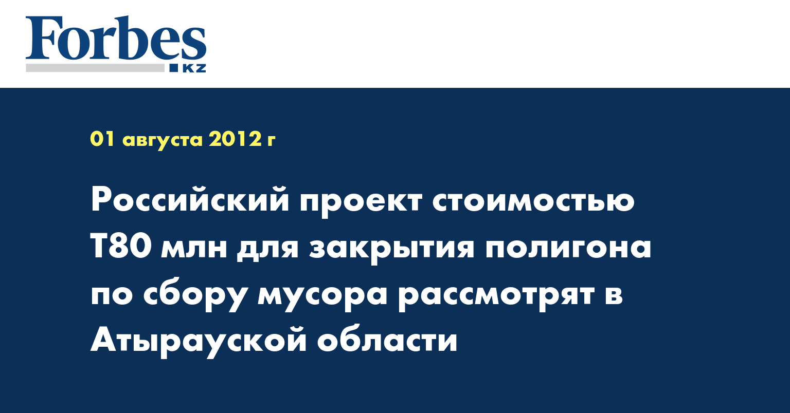 Российский проект стоимостью Т80 млн для закрытия полигона по сбору мусора рассмотрят в Атырауской области, сообщил аким области Бергей Рыскалиев.