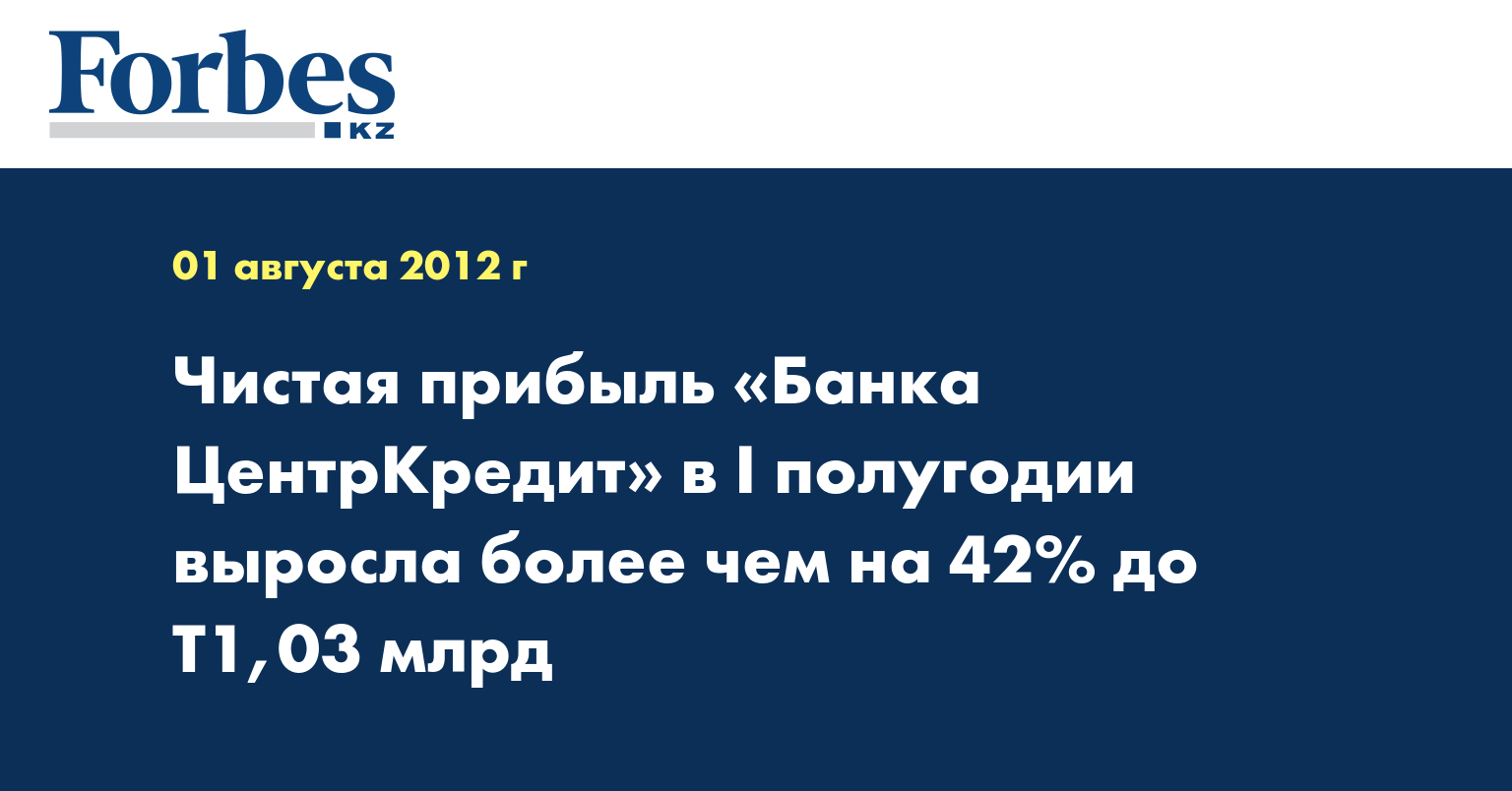 Согласно неконсолидированной неаудированной финансовой отчетности, чистая прибыль АО «Банк ЦентрКредит» в I полугодии выросла на 42,68%, составив Т1,033 млрд против Т724 млн за аналогичный период 2011 года, указывается в информации, размещенной на сайте банка, передает КазТАГ.