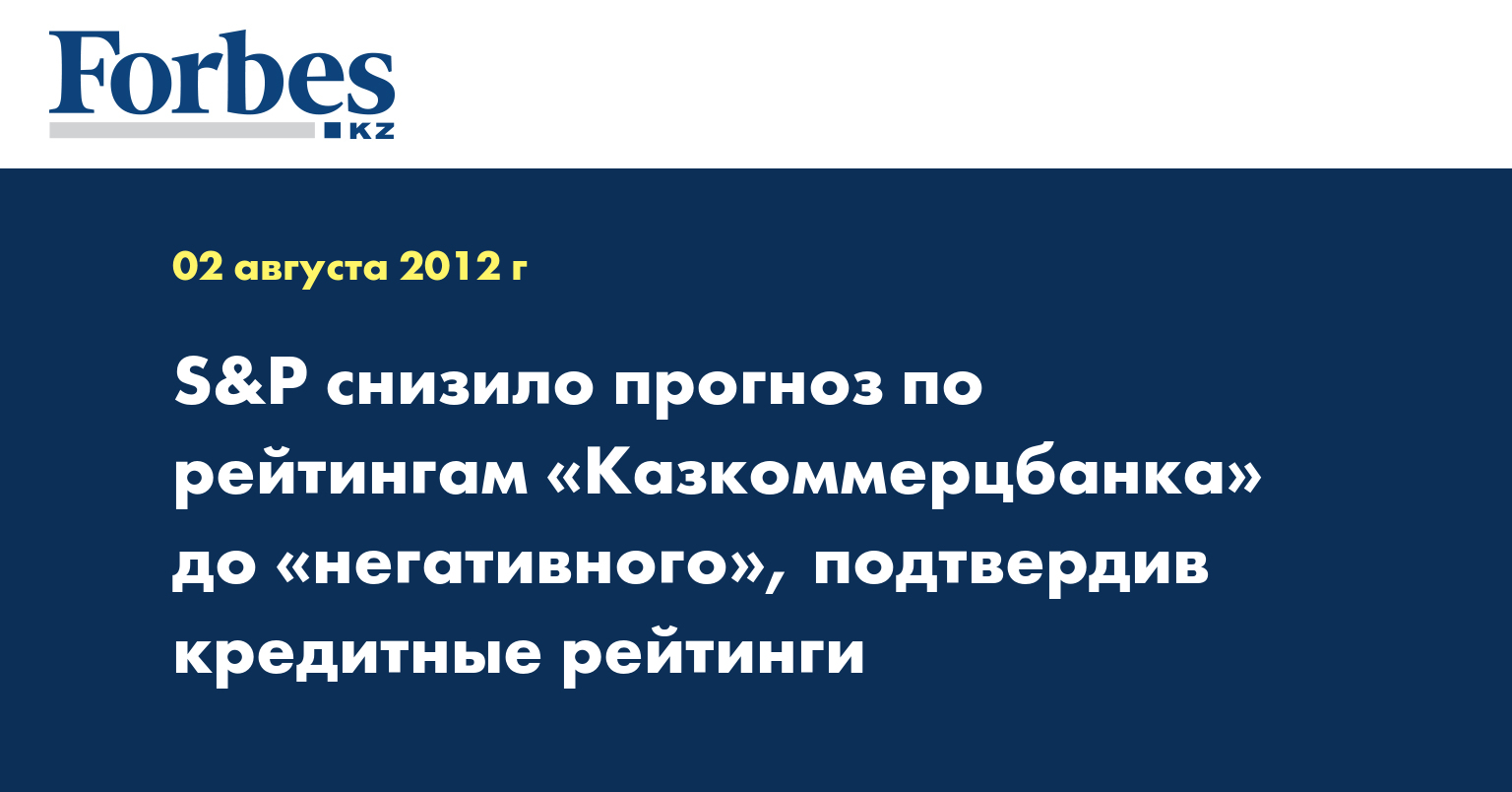 «Служба кредитных рейтингов Standard & Poor's изменила свой прогноз по рейтингам казахстанского АО «Казкоммерцбанк» со «стабильного» на «негативный». Мы подтвердили долгосрочный и краткосрочный кредитные рейтинги контрагента «B+/B», ранее присвоенные этому банку», - говорится в информации, распространенной в среду.