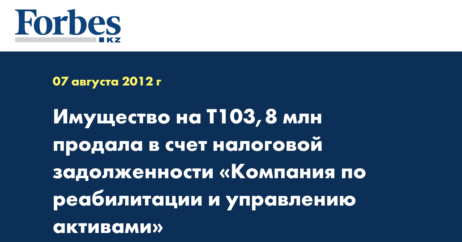 АО «Компания по реабилитации и управлению активами» реализовала ограниченного в распоряжении имущества налогоплательщиков на Т103,8 млн с 1 января по 6 августа текущего года, сообщила президент компании Маржан Кузембаева.