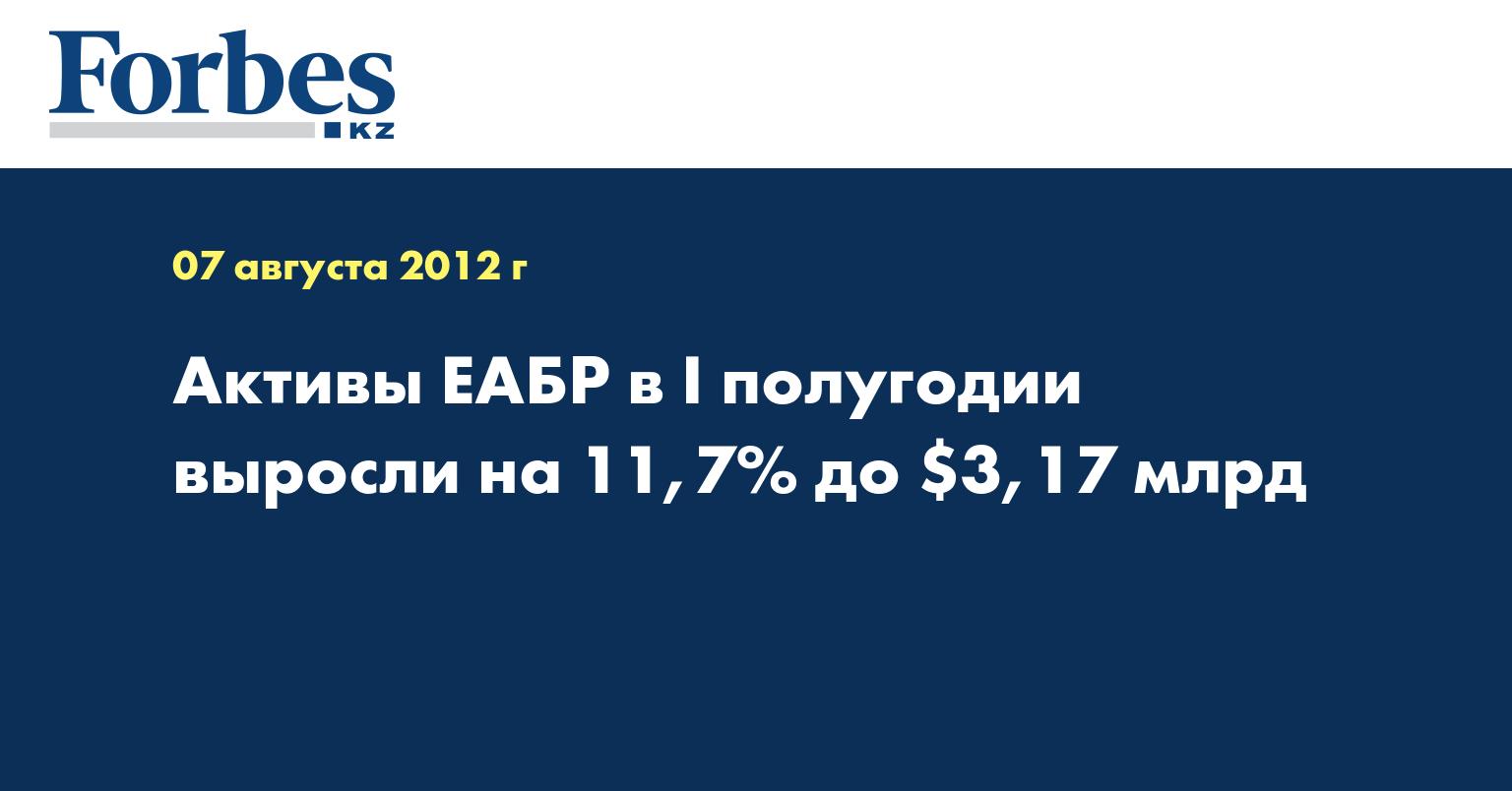 «По итогам первого полугодия активы ЕАБР составили более $3170,2 млн, что на 11,7%, или почти на $332,5 млн больше по сравнению с концом 2011 года. Объем займов, предоставленных клиентам, увеличился на $53,3 млн до $1397,3 млн», - указывается в информации, распространенной во вторник.