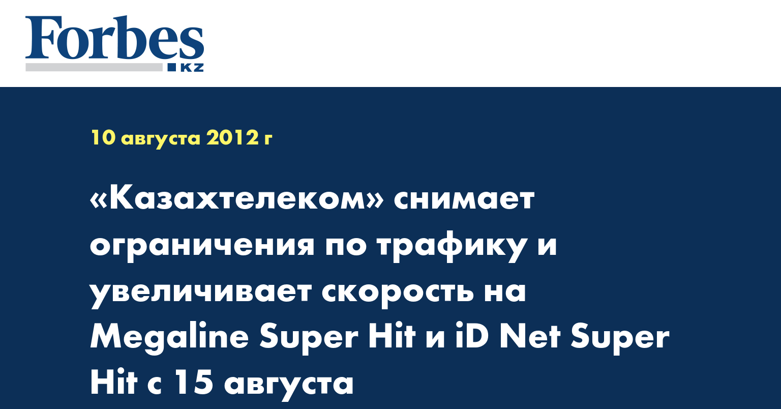 «С 15 августа 2012 года в рамках очередных мероприятий по улучшению условий доступа к сети интернет АО «Казахтелеком» вносит ряд изменений в параметры тарифных планов «Megaline Super Hit» и «iD Net Super Hit»», - отмечается в пресс-релизе, как передает КазТАГ.