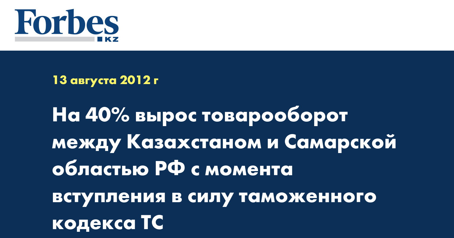 «Таможенный кодекс ТС - это документ, который создает новые условия для работы российских и казахстанских партнеров и упрощает наши торгово-экономические связи. Вступление в силу этого документа значительно сказалось на объемах товарооборота между Самарской областью и Республикой Казахстан. По нашим оценкам, товарооборот вырос с момента вступления документа в силу на 40%», - заявил А. Кобенко на встрече делегации Западно-Казахстанской области в Самаре в минувшую пятницу.