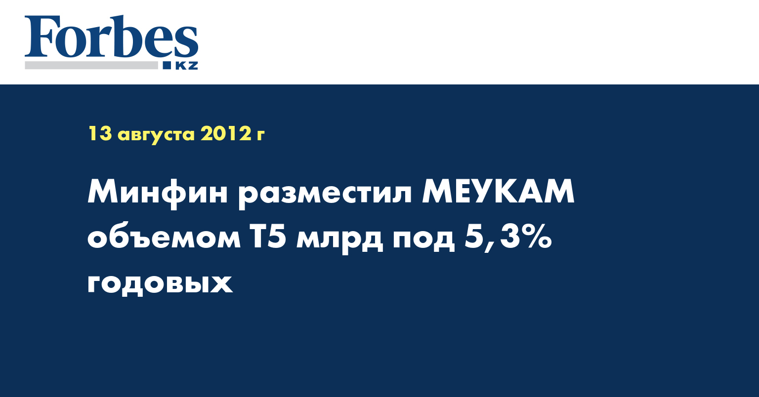 «Министерство финансов Казахстана доразместило на KASE 13 августа 5 млн МЕУКАМ-180 третьего выпуска… под 5,3% годовых», - говорится в сообщении, опубликованном на сайте биржи.
