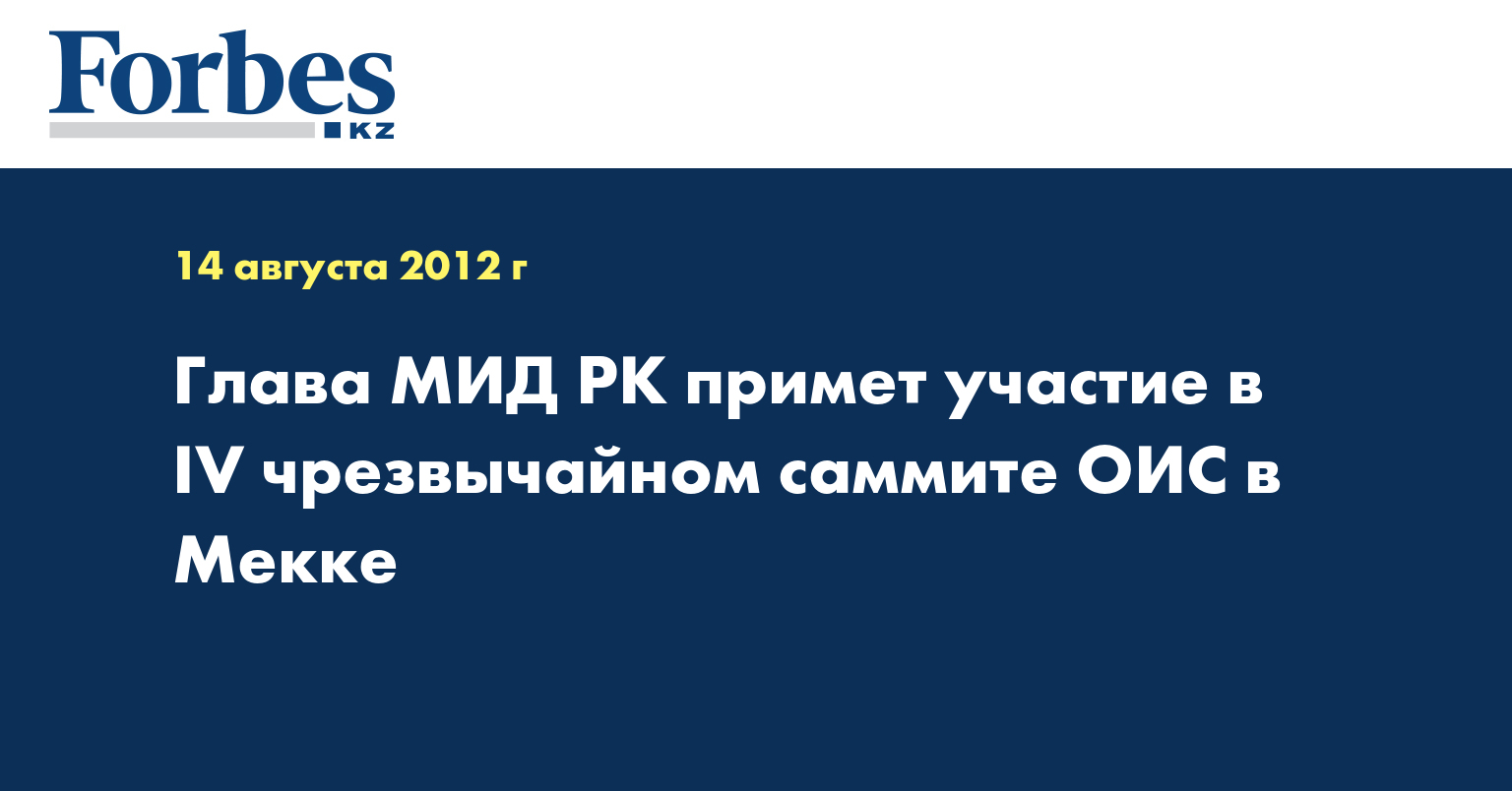 «14-15 августа в Мекке казахстанская делегация во главе с министром иностранных дел Ержаном Казыхановым примет участие в работе 4-го чрезвычайного саммита Организации исламского сотрудничества», - говорится в сообщении, распространенном в понедельник.