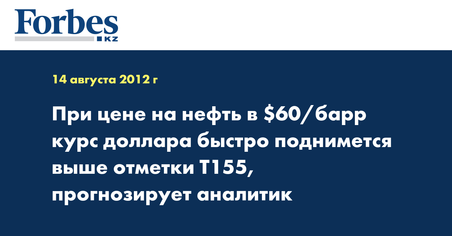 При цене на нефть в $60/барр курс доллара поднимется выше отметки Т155, прогнозирует председатель правления АО «Инвестиционный финансовый дом «Resmi» Александр Манаенко.
