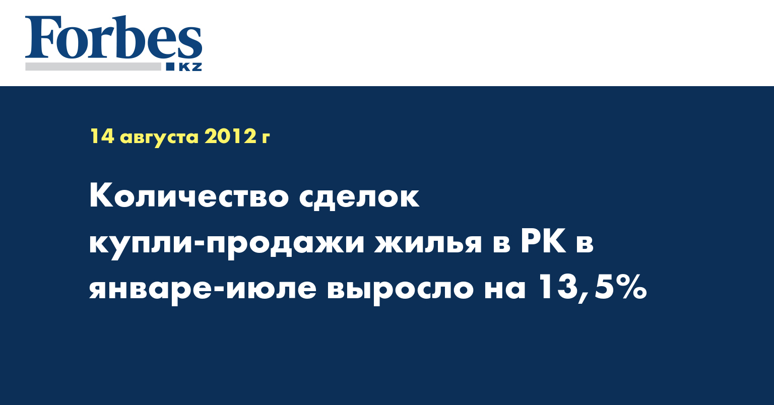 Согласно документу, в июле 2012 года количество зарегистрированных сделок купли-продажи жилья составило 16 536 и по сравнению с предыдущим месяцем увеличилось на 10,7%, передает КазТАГ.