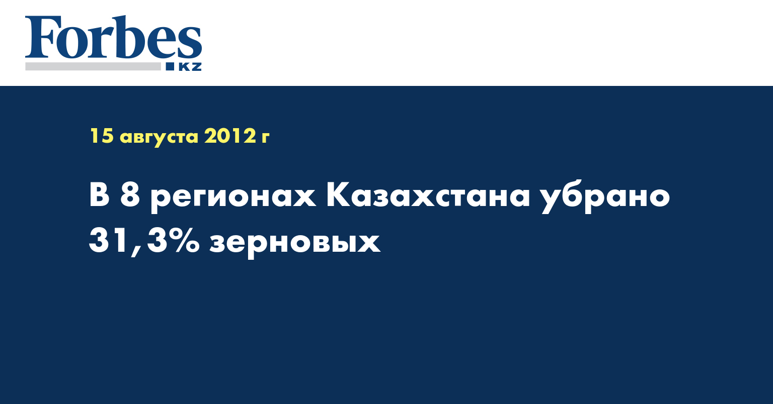 «В восьми областях республики проводится уборка нового урожая. По данным областных управлений сельского хозяйства на 14 августа текущего года сельхозтоваропроизводителями убрано 837,1 тыс. га, что составляет 31,3 % от уборочной площади областей, намолочено 789,1 тыс. тонн, средняя урожайность составила 9,4 ц/га», - говорится в сообщении, размещенном на сайте министерства в среду.