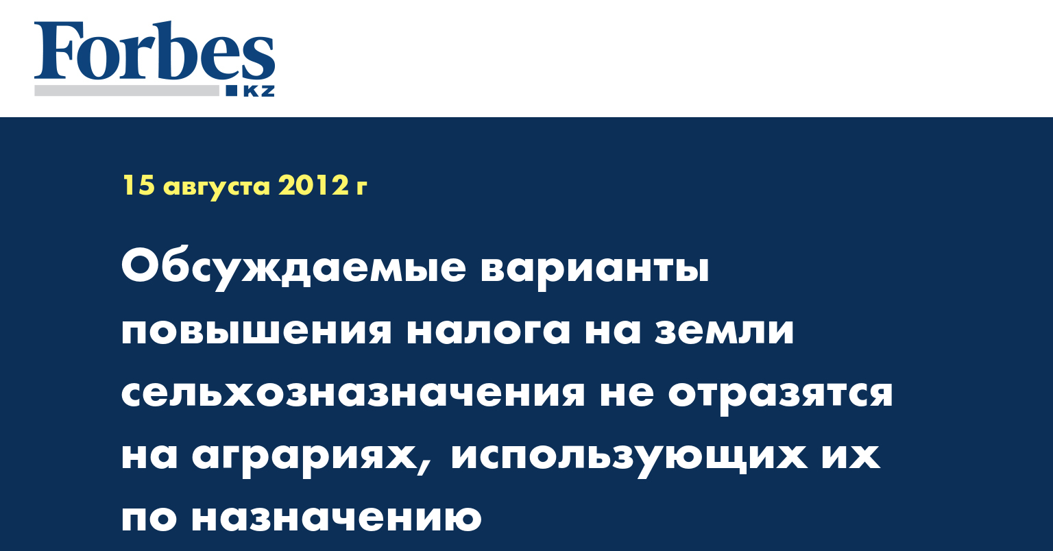 Напомним, повышение земельного налога в несколько раз предлагается в проекте программы развития агропромышленного комплекса РК на 2013-2020 годы, опубликованном на сайте министерства сельского хозяйства. Предполагается, что эти меры приведут к вводу в оборот до 2 млн га бездействующих земель.