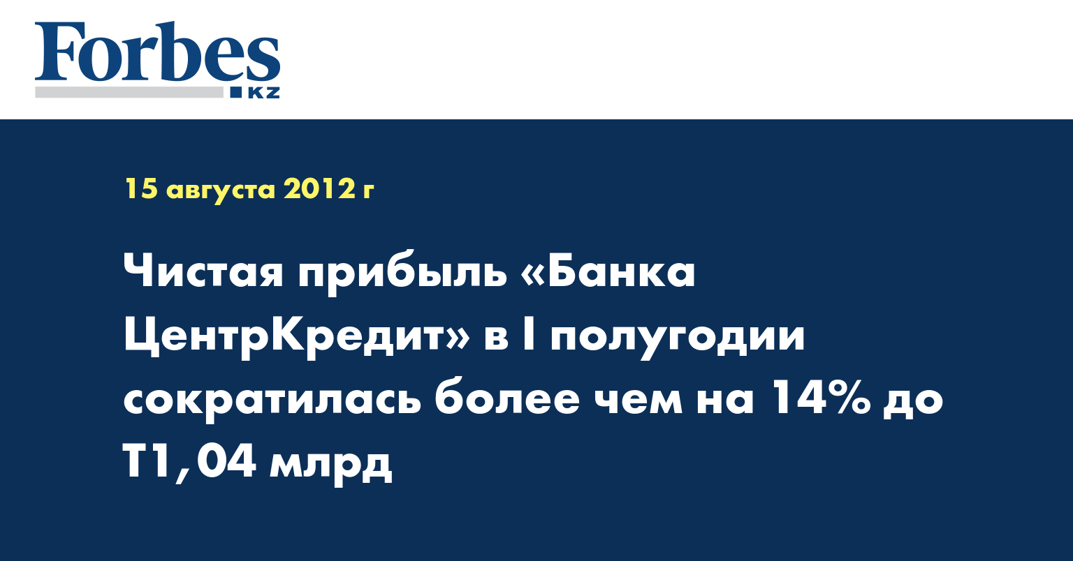 Чистая прибыль АО «Банк ЦентрКредит», согласно промежуточной консолидированной финансовой отчетности, в I полугодии сократилась на 14,73%, составив Т1,042 млрд против Т1,222 млрд за аналогичный период 2011 года, указывается в сообщении банка, размещенном на сайте Казахстанской фондовой биржи (KASE), передает КазТАГ.