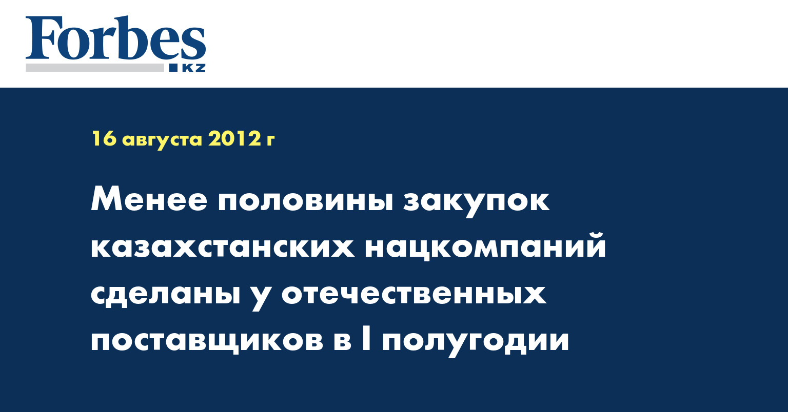 «По итогам 5 месяцев 2012 года общий объем закупа товаров, работ и услуг недропользователей горнорудного и нефтегазового комплексов составил 553 448,5 млн тенге, в том числе у казахстанских производителей - на сумму 285 792,8 млн тенге. Доля казахстанских ТРУ - 51,64%», - сообщили в МИНТ.