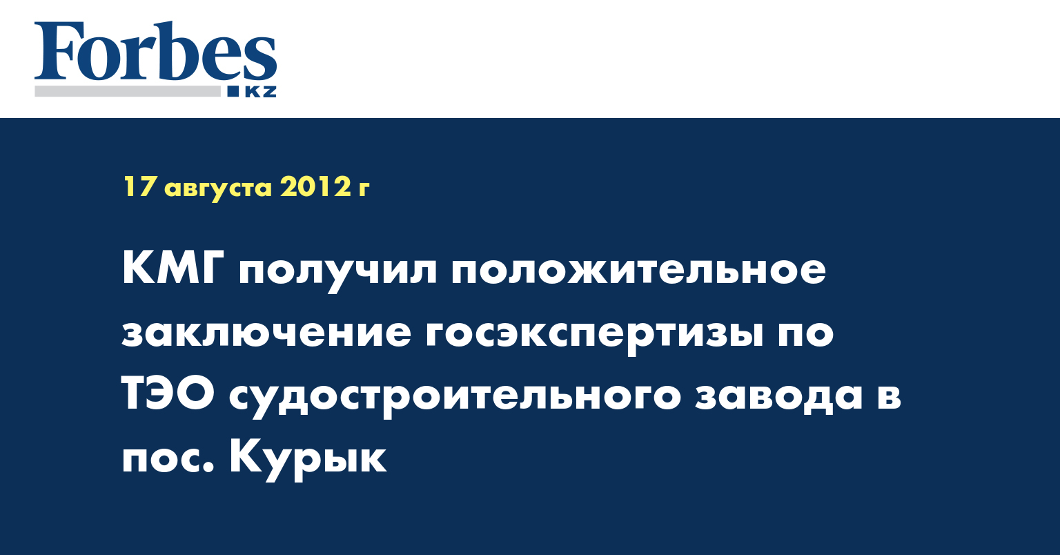 АО «НК «КазМунайГаз» (КМГ) получило положительное заключение государственной экспертизы по технико-экономическому обоснованию (ТЭО) строительства судостроительного/судоремонтного завода в пос. Курык, указывается в сообщении компании, передает КазТАГ.
