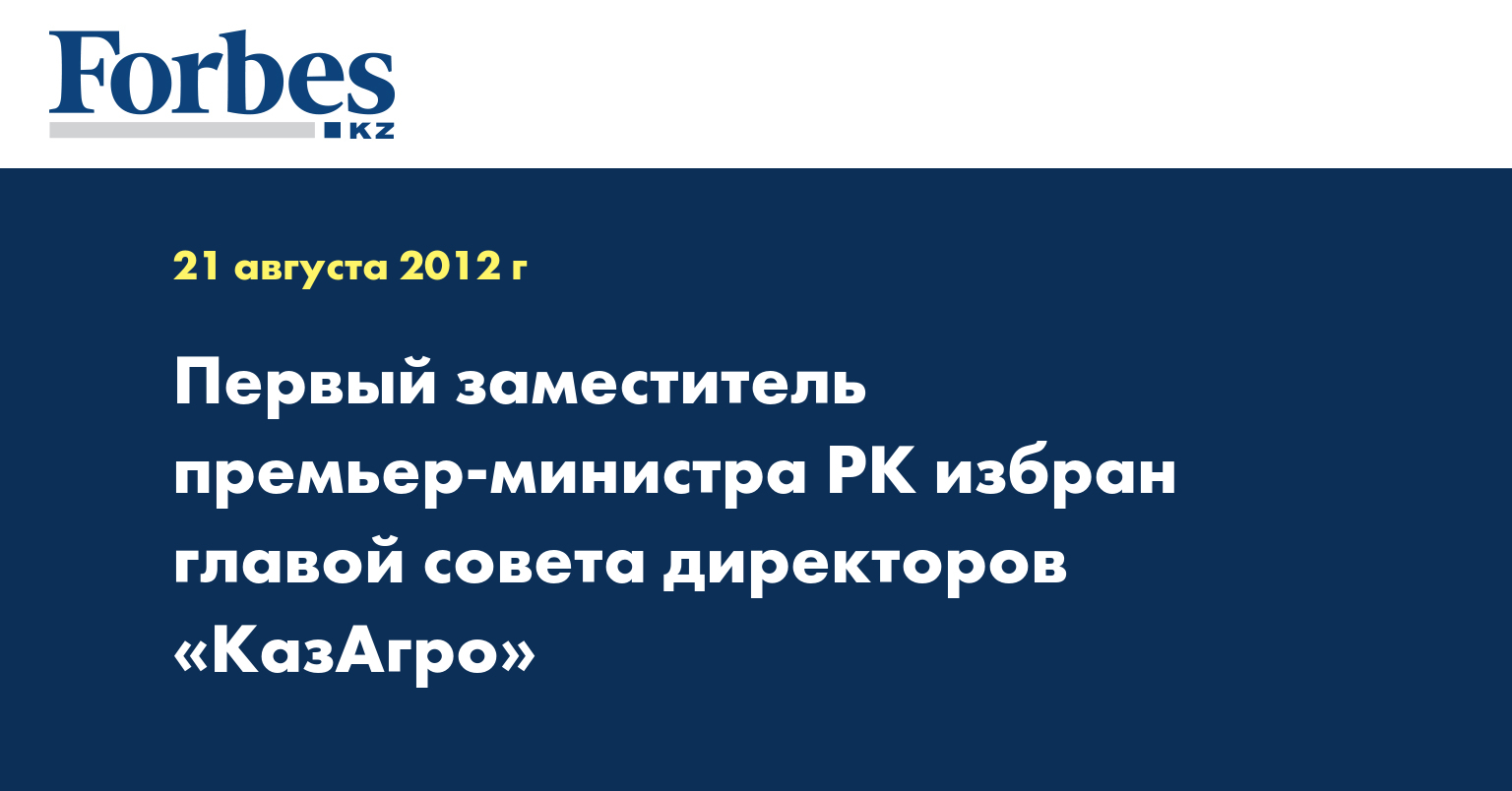 «Первый заместитель премьер-министра РК Серик Ахметов избран председателем совета директоров АО «Национальный управляющий холдинг «КазАгро». Данное решение было принято советом директоров холдинга 20 августа 2012 года», - сообщила пресс-служба компании.