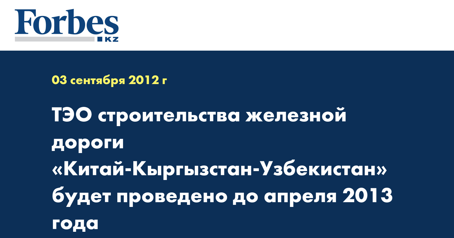 «До апреля 2013 года будет проведено ТЭО для обозначения условий строительства железной дороги «Китай-Кыргызстан-Узбекистан». Оно будет проведено за счет китайской стороны, из государственных средств Кыргызстана не будет затрачено ни тыйина. На встрече президента А. Атамбаева с премьер-министром госсовета КНР В. Цзябао все предыдущие договоренности по строительству железной дороги были подтверждены. Глава госсовета озвучил просьбу ускорить процесс реализации проекта», - сказал С.Исаков, сообщает КазТАГ.