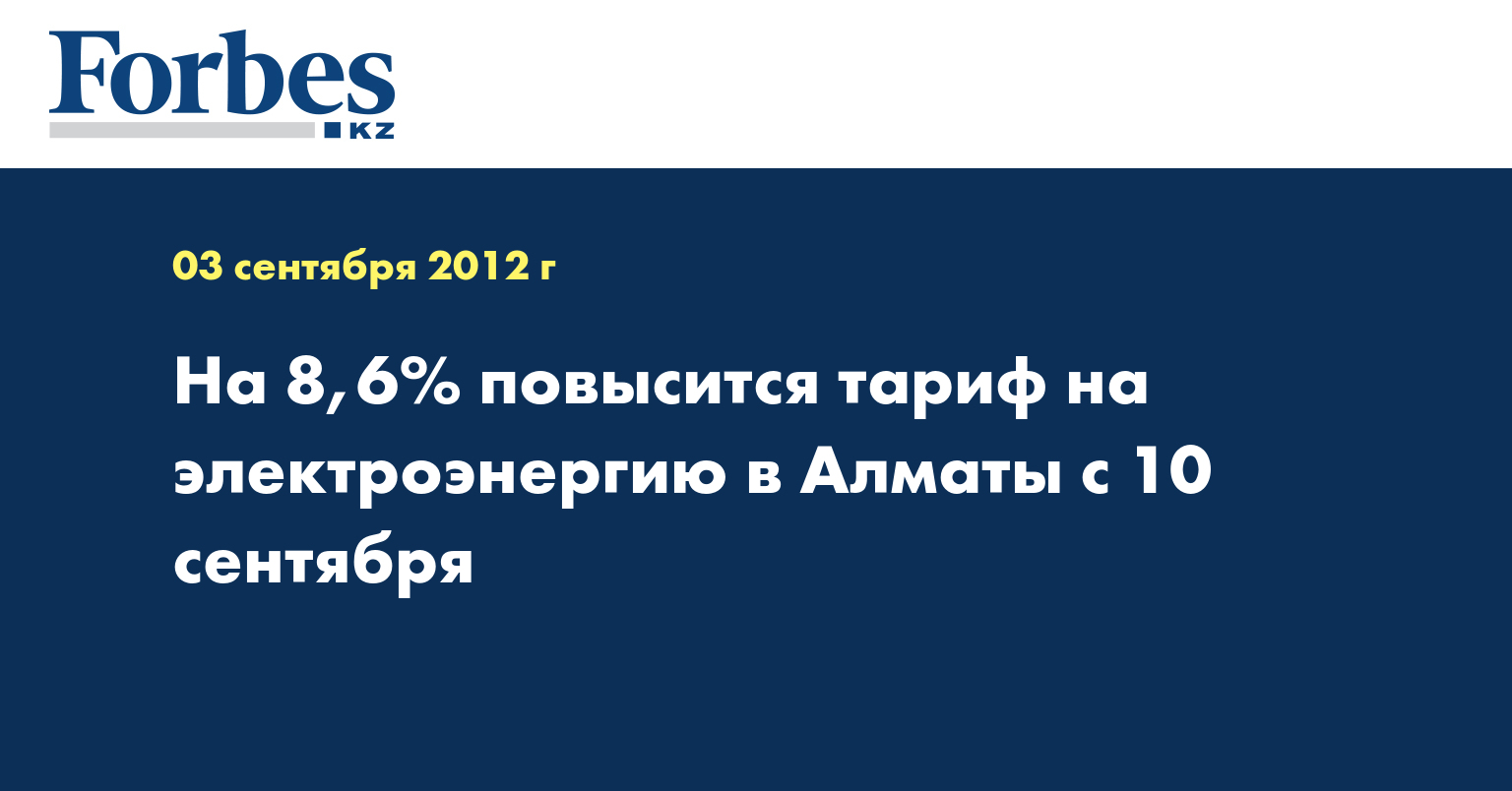 «ТОО «АлматыЭнергоСбыт» извещает потребителей электроэнергии о том, что с 10 сентября 2012 года в г.Алматы и регионе Алматинской области повышается уровень отпускного тарифа на электроэнергию на 8,6% с 11,79 до 12,80 тенге (без НДС)», - говорится в сообщении в понедельник.