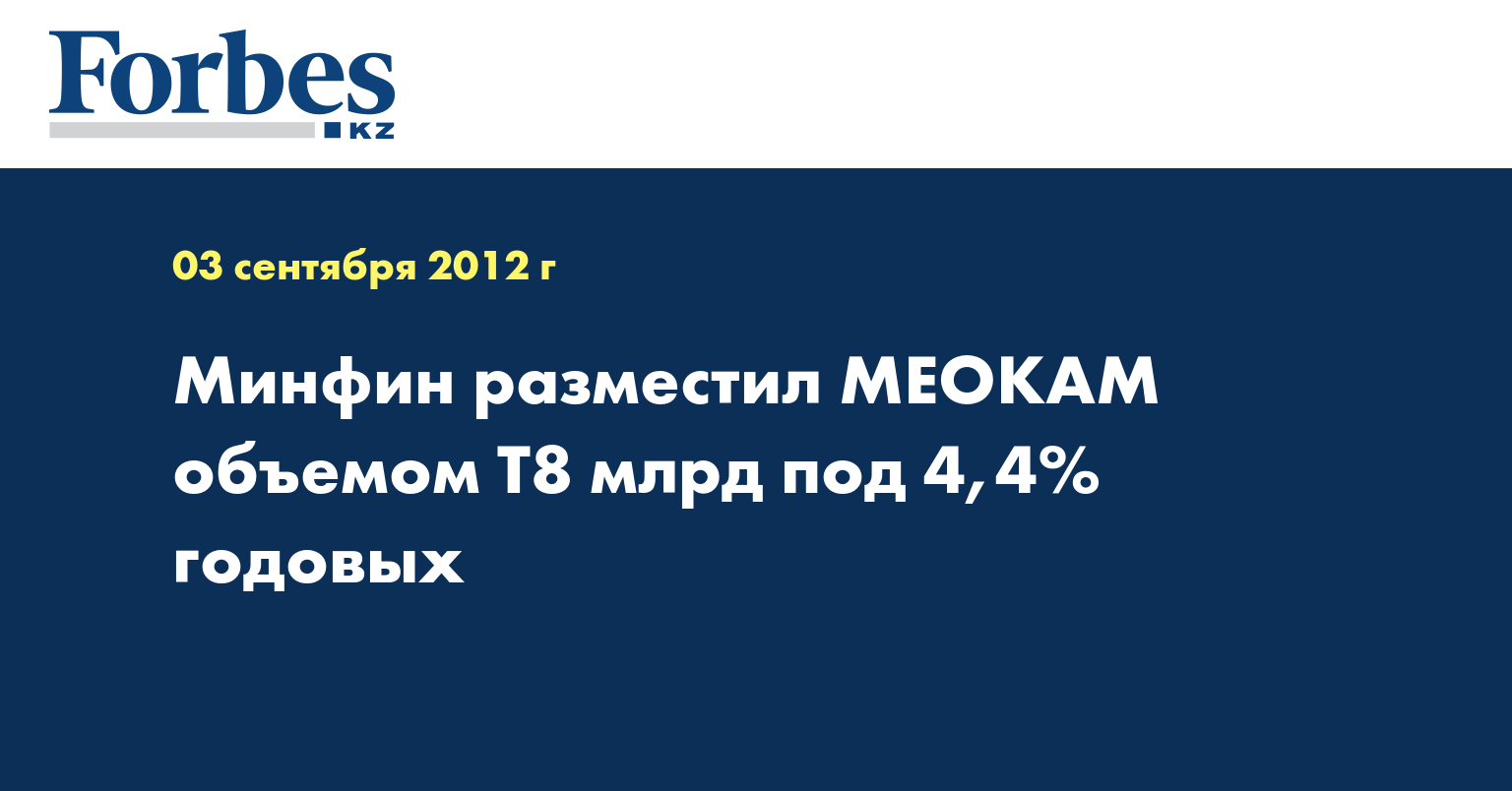 «Министерство финансов Казахстана доразместило на KASE 3 сентября 8 млн МЕОКАМ-60 выпуска 33… под 4,4% годовых», - указывается в сообщении, опубликованном на сайте биржи.