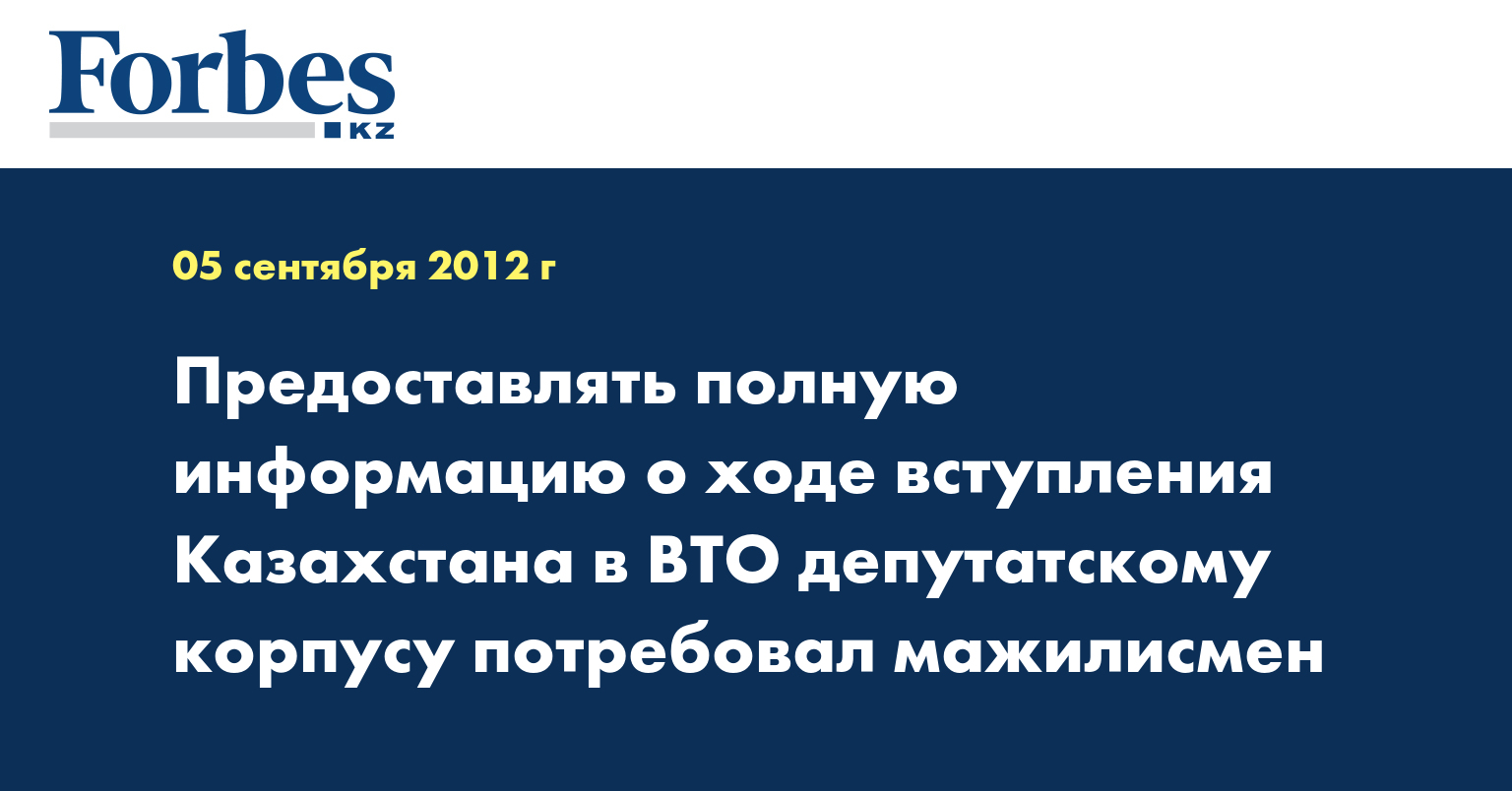 «В России пакет документов при вступлении в ВТО составлял более 1,5 тысяч страниц, а в госдуме его рассматривали чуть более месяца, что и вызвало законное возмущение наших российских коллег. Мы не должны этого допустить. Поэтому в целях обеспечения транспарентности, прошу вас предоставить полную информацию о планируемых сроках вступления Казахстана в ВТО, о текущем состоянии переговорного процесса, об уже согласованных условиях вхождения Казахстана в ВТО, сделать такую информацию открытой для общественности», - сказал Т. Омурзаков в своем депутатском запросе на имя министра экономической интеграции Жанар Айтжановой.