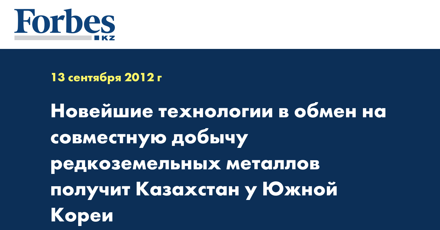 «Мы будем вместе с корейскими компаниями добывать редкоземельные металлы в обмен на новейшие технологии. Технология и индустрия Южной Кореи являются передовыми. Эта страна на 4 месте в азиатском тихоокеанском регионе», - сказал Н. Назарбаев в ходе встречи с президентом Республики Корея Ли Мён Баком в четверг.
