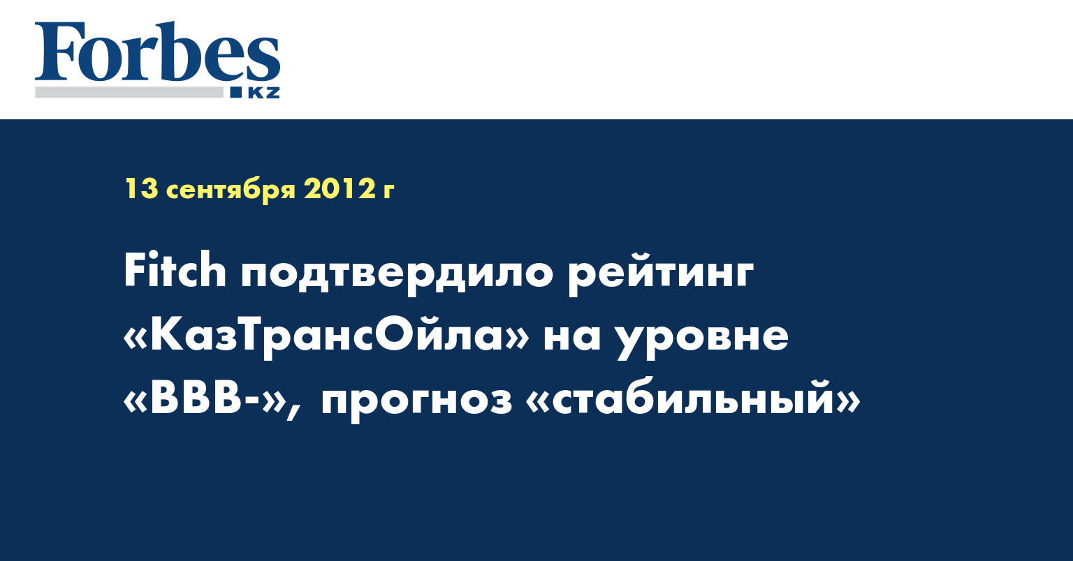 «Fitch Ratings подтвердило рейтинги казахстанской компании АО «КазТрансОйл» (КТО): долгосрочный рейтинг дефолта эмитента (РДЭ) в иностранной валюте на уровне «BBB-» и краткосрочный РДЭ в иностранной валюте «F3». Прогноз по долгосрочному РДЭ – «Стабильный», - отмечается в пресс-релизе.