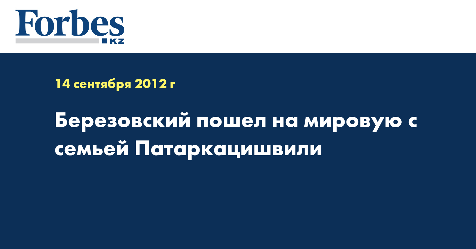 Бизнесмен Борис Березовский заключил мировое соглашение с семьей бывшего делового партнера Бадри Патаркацишвили, сообщает Forbes со ссылкой на неназванные источники. Сумма мировой неизвестна. Ожидается, что официально о ней будет объявлено в октябре 2012 года, передает Lenta.ru.