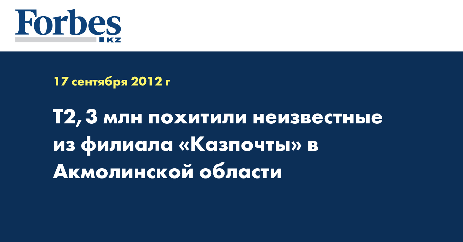 «В ночь на 16 сентября неизвестные лица отжали решетки, разбили стекла и проникли в здание филиала «Казпочты». Из сейфа похищено 2 миллиона 325 тысяч тенге, предназначенные для выдачи пенсии», - рассказали в ДВД в понедельник.