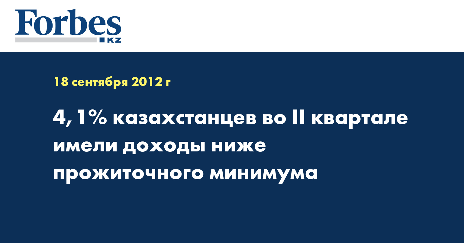 «По данным обследования домашних хозяйств, доля населения, имеющего доходы ниже прожиточного минимума, в Республике Казахстан во II квартале 2012 года составила 4,1% (687,5 тыс. человек), что на 1,8 процентных пункта ниже, чем в соответствующем периоде предыдущего года», - отмечается в распространенном во вторник пресс-релизе.