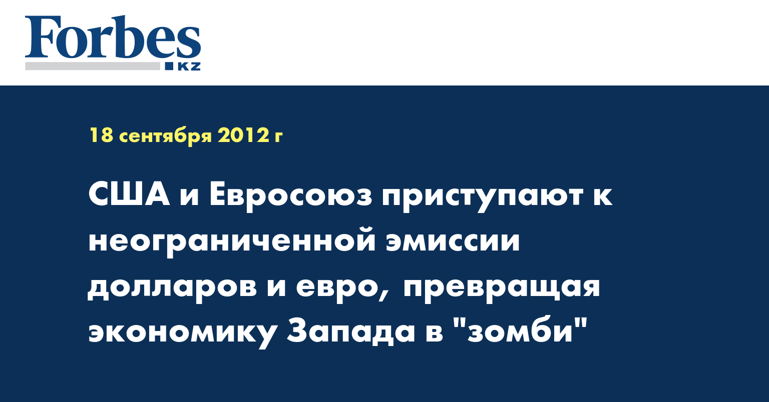 К последнему и самому сильному из всех оставшихся в их распоряжении средств – переходу на неограниченное печатание денег – евро и доллара перешли два крупнейших Центральные банка Запада – Федеральная резервная система /ФРС/ США и Европейский центральный банк /ЕЦБ/. Несколько дней назад ФРС объявила, что приступает к новой и третьей по счету программе количественного смягчения или QE3. Она уже получила неофициальное название QE-бесконечность, передает ИТАР-ТАСС.