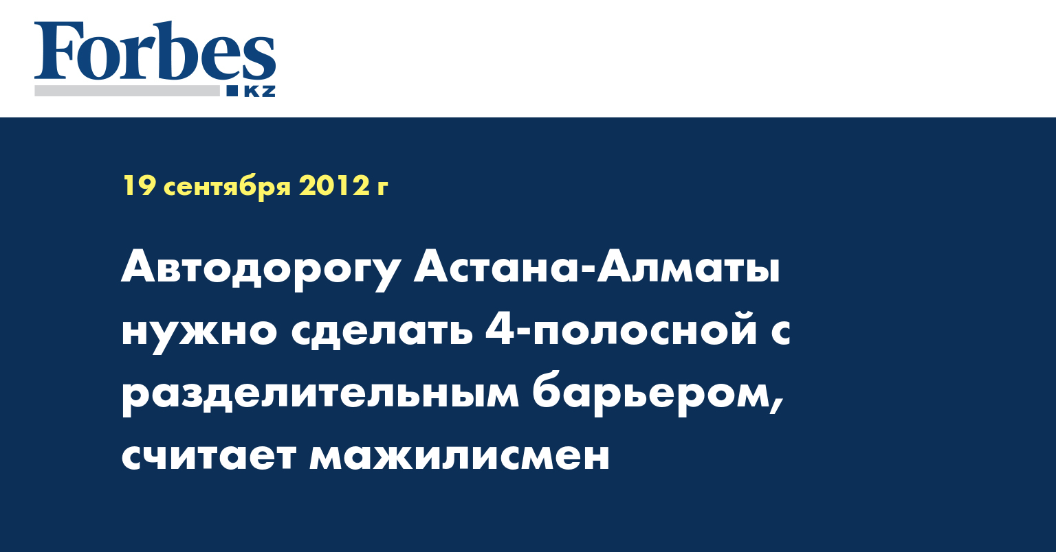 «Эта трасса единственная дорога, которая связывает не только указанные крупнейшие мегаполисы страны, но также и соседние с нами государства. С каждым годом на ней нарастает пассажиро- и грузопоток. В этой связи полагаем необходимым поставить вопрос о модернизации трассы Алматы-Астана путем расширения ее до 4 полос и установления разделительного барьера между встречными направлениями», - обратился он к главе правительства на пленарном заседании в среду.
