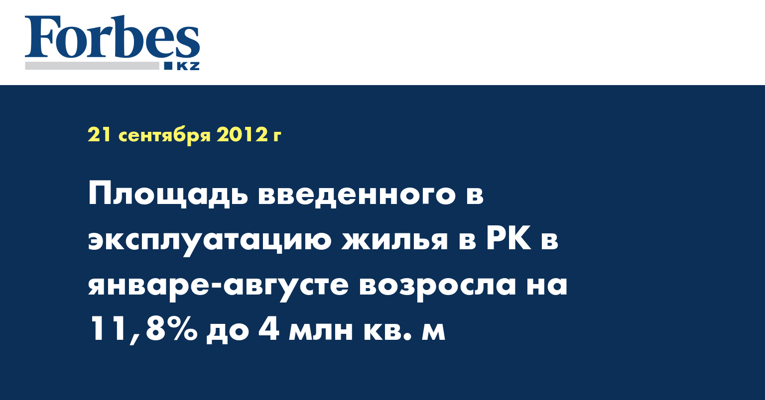 Площадь жилья, введенного в эксплуатацию в Казахстане в январе-августе текущего года, возросла к аналогичному периоду 2011 года на 11,8% до 4036,9 тыс. кв. м, сообщило агентство РК по статистике, передает КазТАГ.