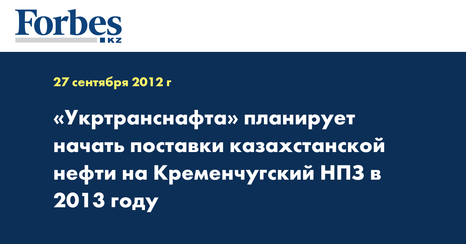 Компания «Укратранснафта» планирует начать поставки нефти сорта Tengiz из Казахстана на Кременчугский НПЗ в 2013 году, сообщили «Украинские новости».