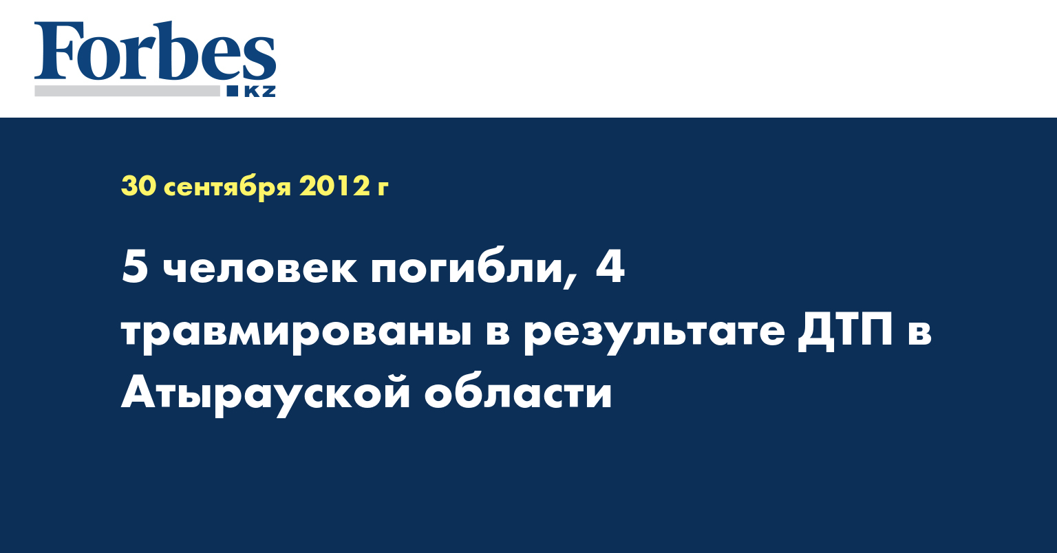 В результате ДТП, случившегося 29 сентября на 172 км автодороги Атырау-Уральск в Индерском районе Атырауской области, погибли 5 человек, еще 4 госпитализированы, сообщила пресс-служба МЧС Казахстана.