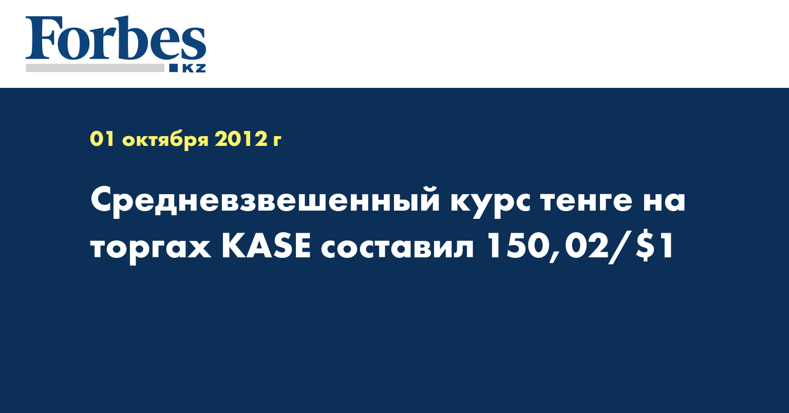 Средневзвешенный курс тенге к доллару США по итогам состоявшихся в понедельник торгов на Казахстанской фондовой бирже (KASE) составил 150,02/$1, передал КазТАГ. Относительно предыдущего торгового дня доллар вырос на 0,16 тенге.