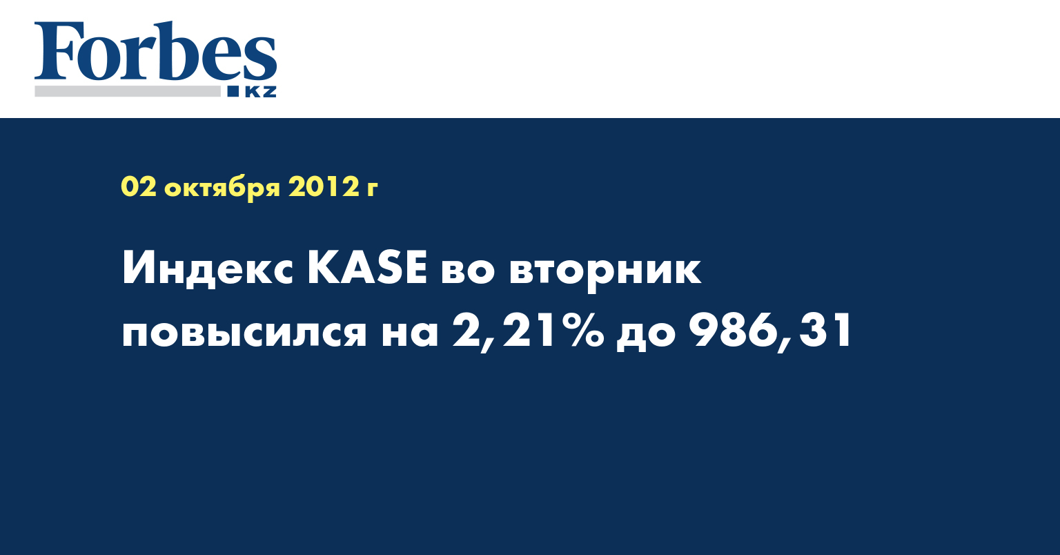 По итогам торгов акциями на Казахстанской фондовой бирже (KASE) во вторник значение индекса KASE повысилось на 2,21% - с 964,97 до 986,31, сообщает КазТАГ.