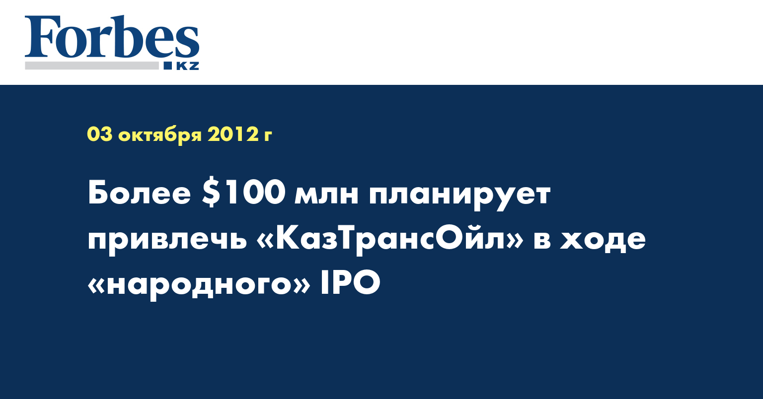 Как отмечается в публикации, АО «КазТрансОйл» будет в числе первых компаний, которые выставят свои акции на торги на местной бирже. Дата для начала «народного IPO» еще не определена.